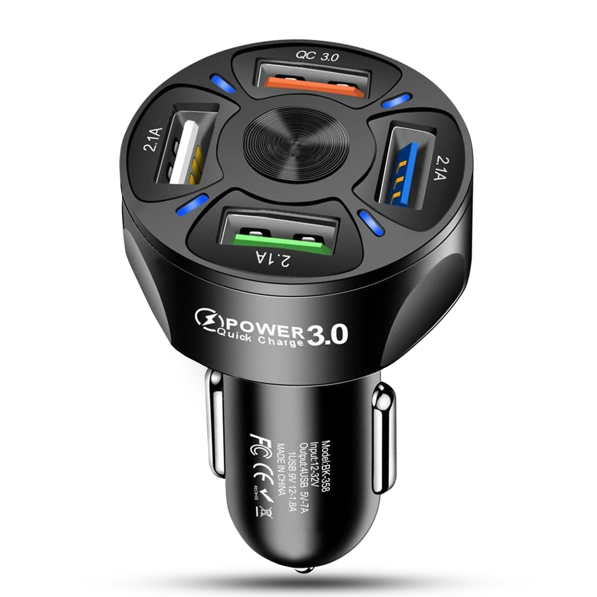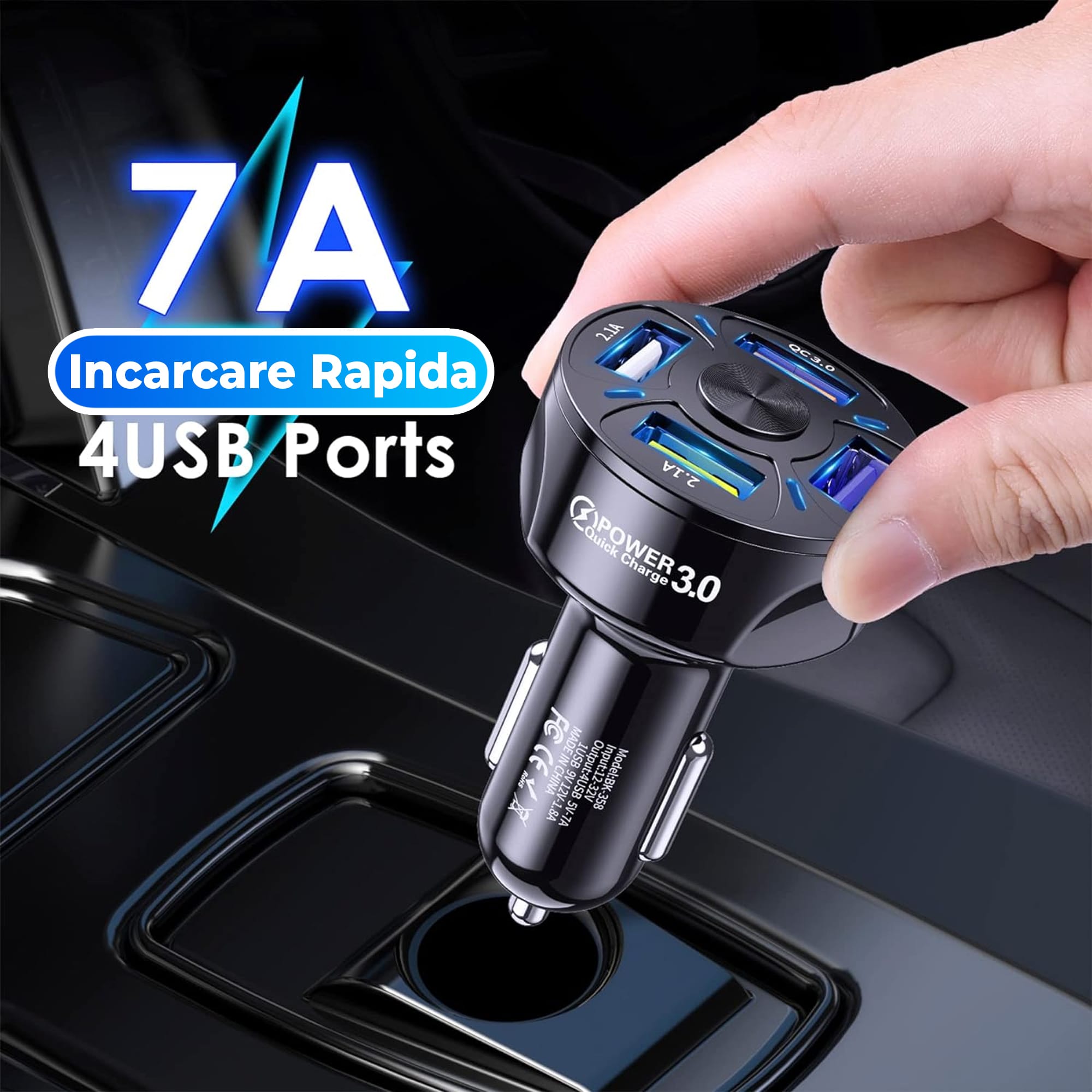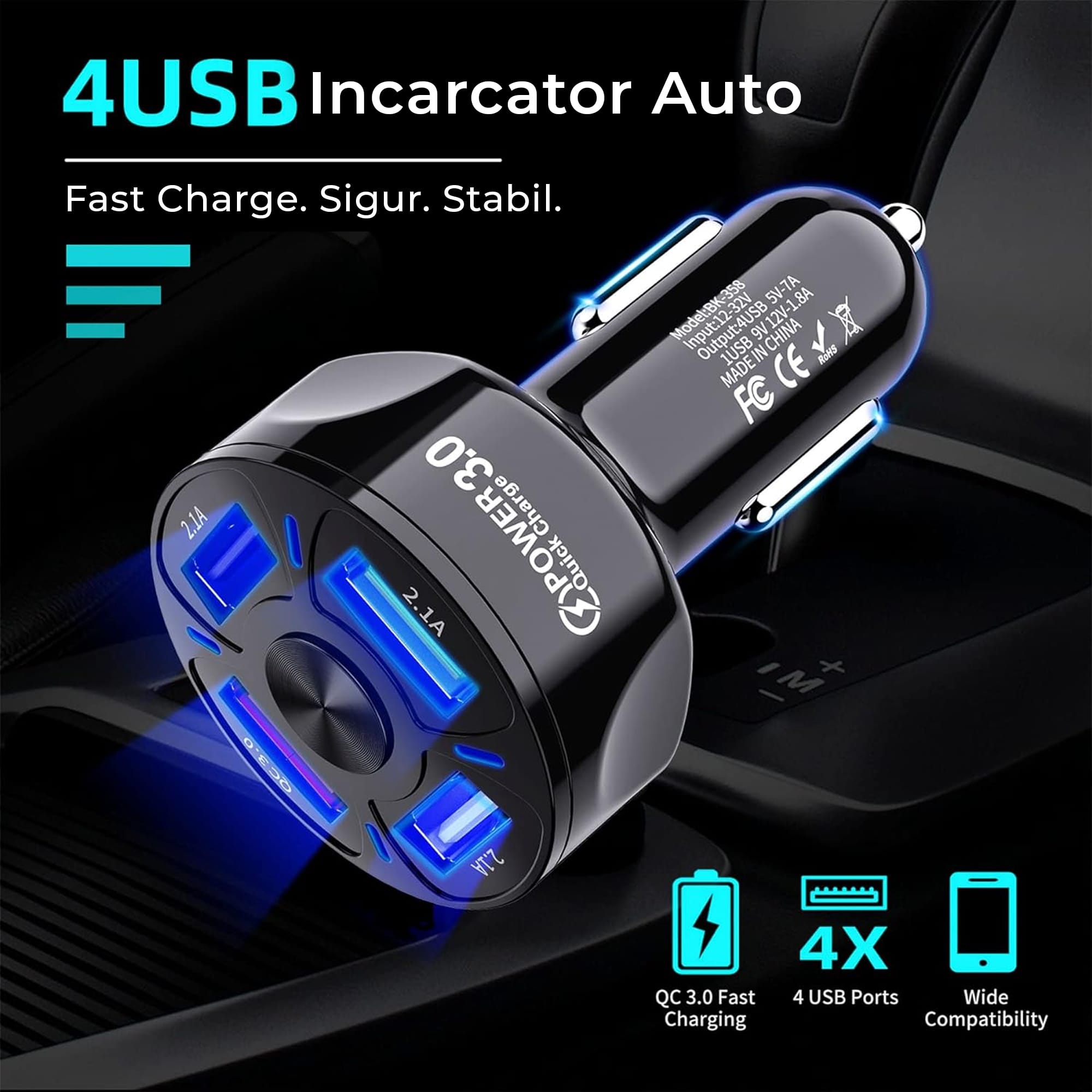 Incarcator auto Timebox, Super Fast-Charge, 4 x USB QC 3.0 Lumini LED, Universal, Negru