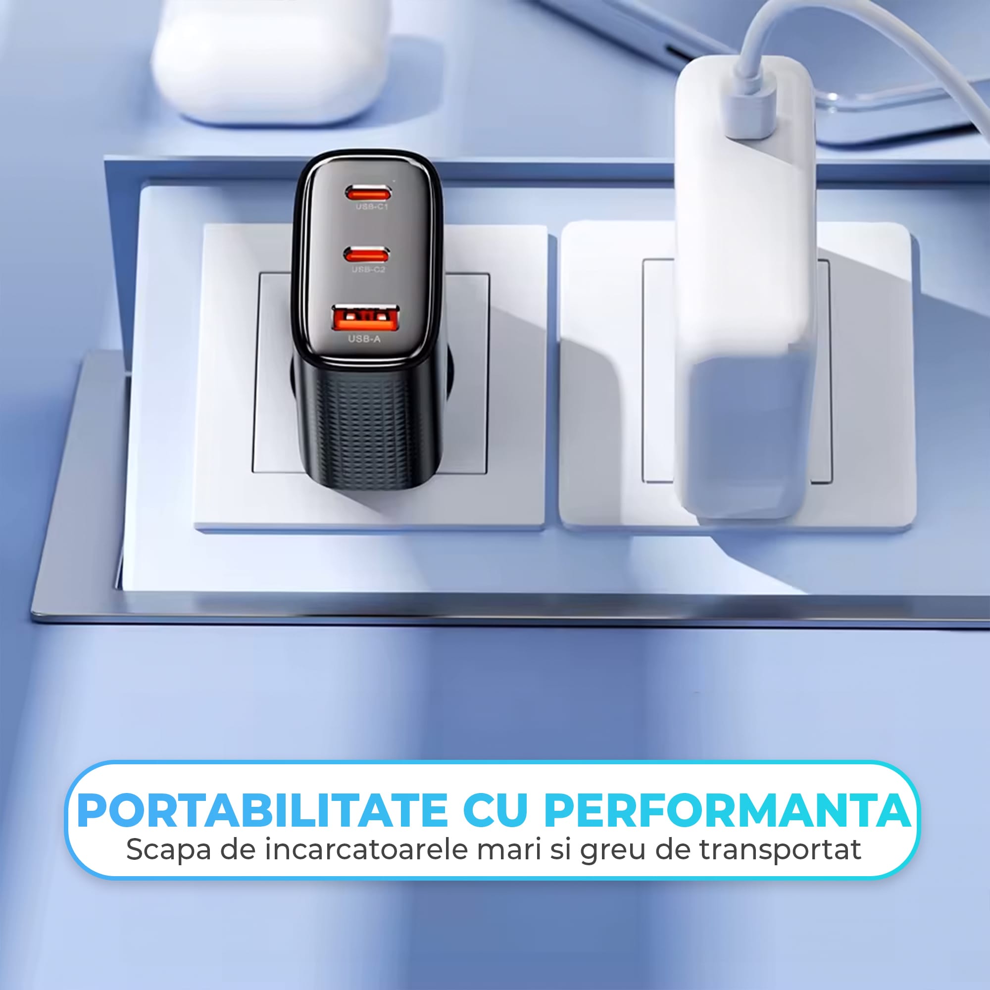 - Trei Porturi de Încărcare: 2 x Type-C și 1 x USB, compatibil cu o gamă largă de dispozitive.