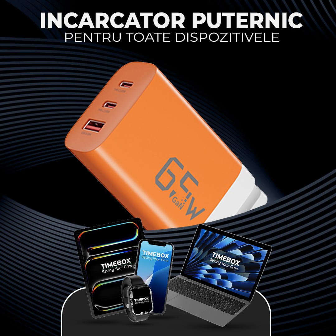 Incarcator Retea Timebox, 3 Porturi, 65W Fast Charge, 2 x Type-C, 1 x USB, Portocaliu