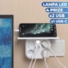 Priza cvadrupla Timebox, cu 2 x USB, cu suport pentru telefon integrat, lumina LED, Alb