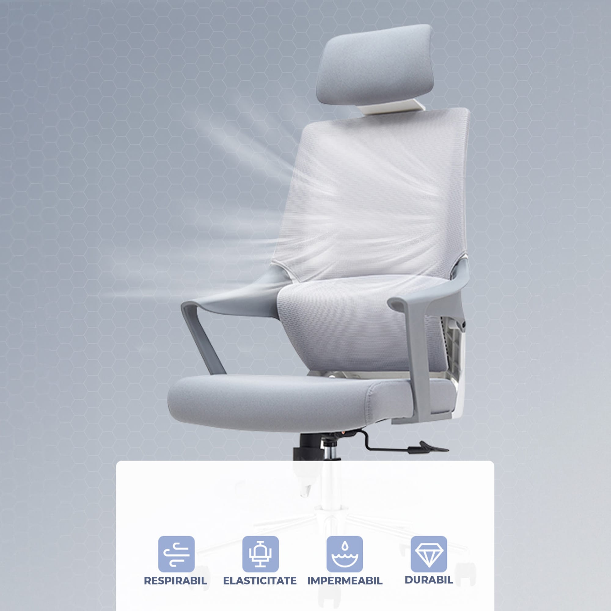 Scaun ergonomic Timebox, Office, Reglare inaltime spatar 120°, Plasa Mesh, Spuma cu Memorie, Profil lombar, Baza din aluminiu durabil, Gri