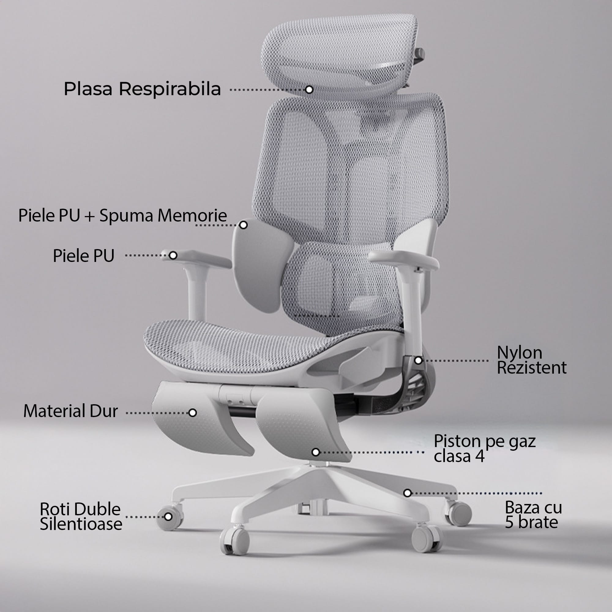 Scaun Ergonomic Timebox pentru Birou si Gaming – Material Mesh Respirabil, Tetiera 4D, Brate 3D/4D/6D, Suport pentru Picioare, Design Modern, Ideal pentru Lucru si Gaming de Lunga Durata, Gri