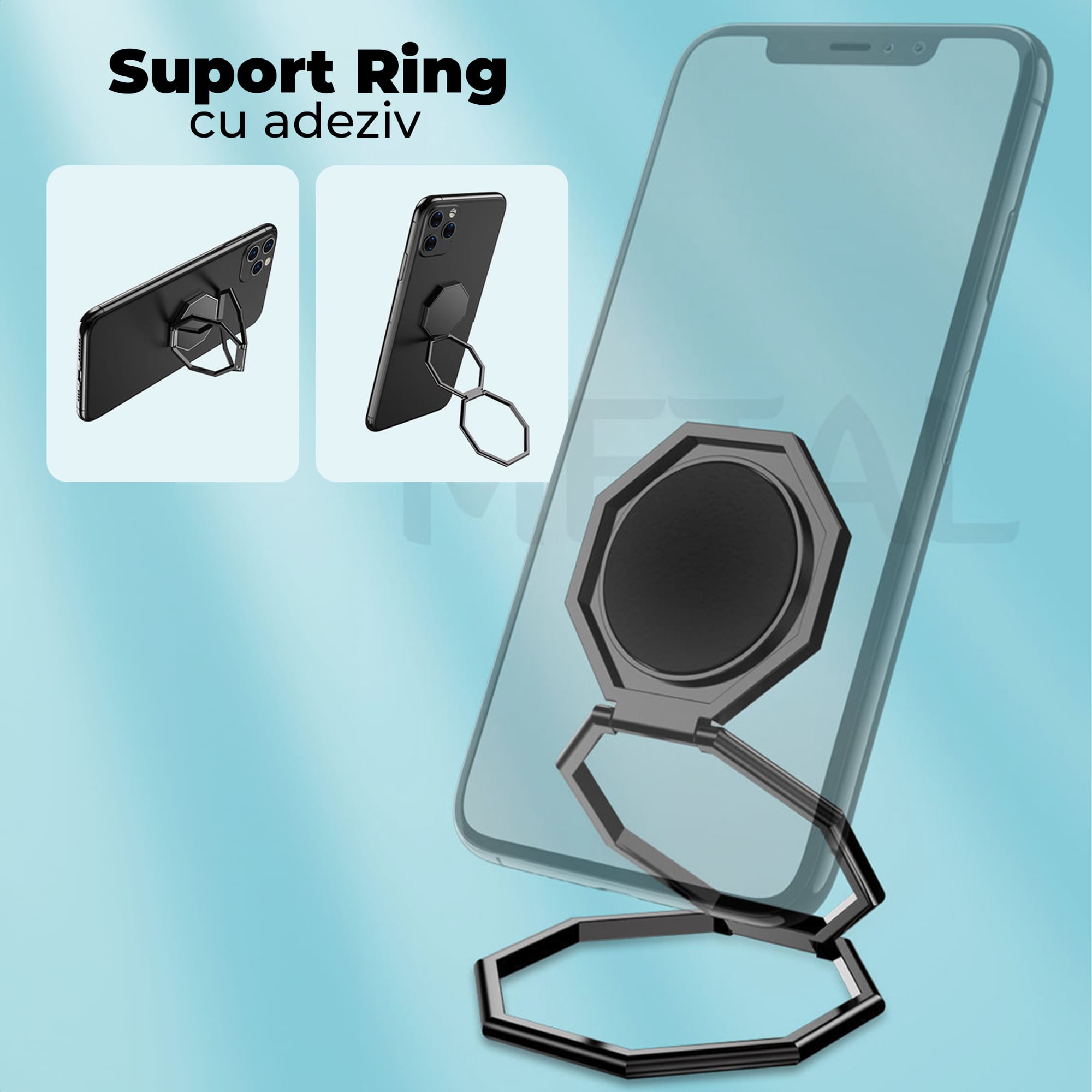 Suport Timebox Ring Grip, cu adeziv, Compatibil iPhone, Samsung, Huawei, Pixel, Negru